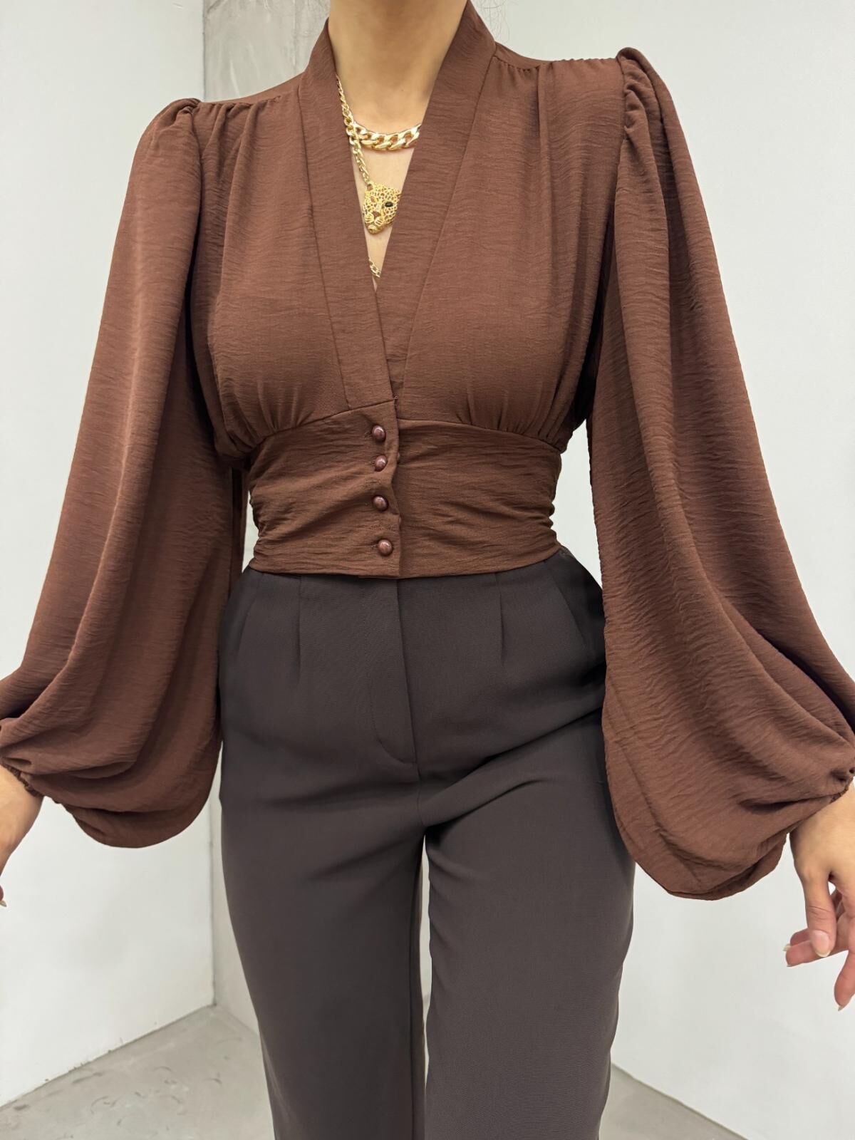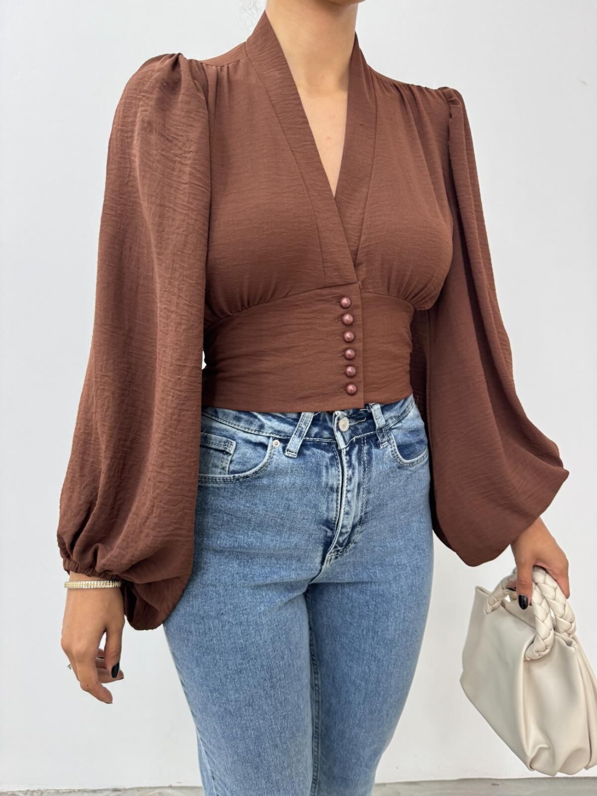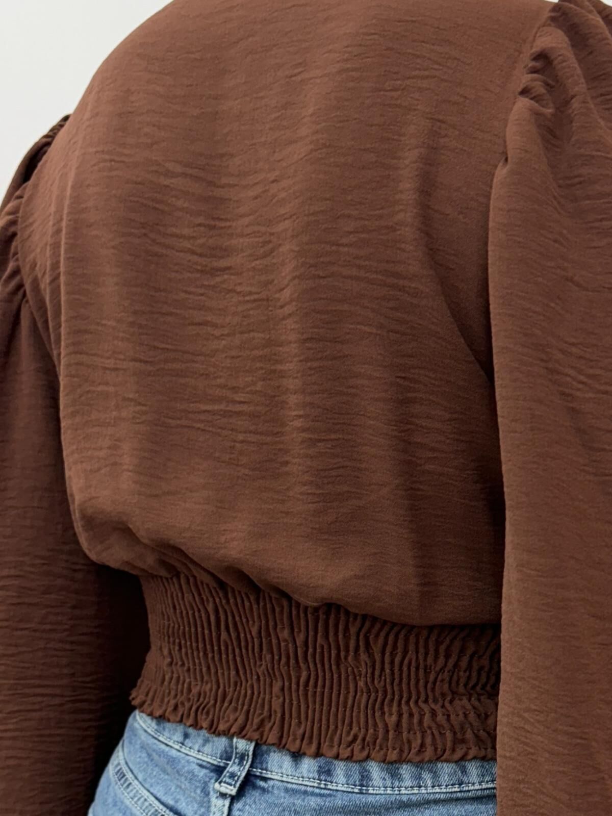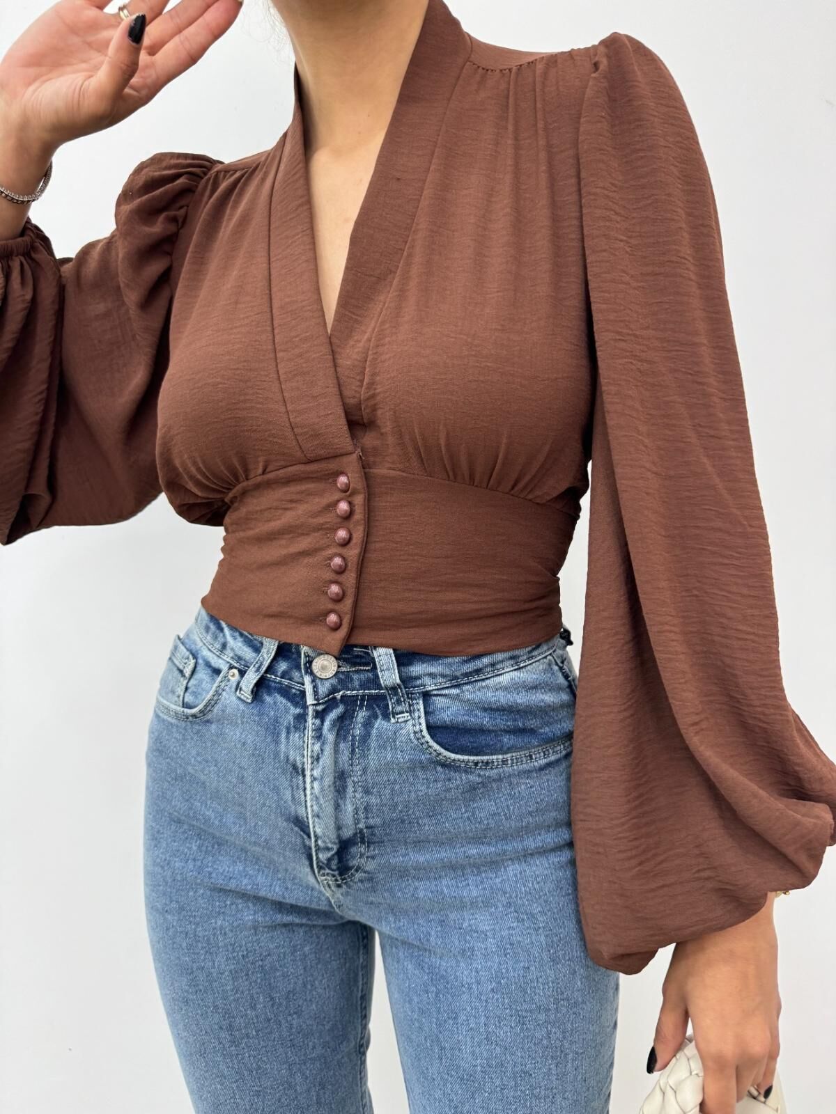 Kahverengi bu balon kol sandy crop bluz, şıklığınızı ön plana çıkarırken rahatlığı da elden bırakmaz.; - V yaka tasarımı ile feminen bir görünüm sunar ve her türlü kombininize zarif bir dokunuş katar.; - Crop boyu sayesinde modern ve dinamik bir stil oluştururken, düz kesimiyle zamansız bir tarza sahiptir.; - Düğmeli kapama şekli pratik kullanım sağlarken, şık detaylarıyla göz alıcı bir görünüm kazandırır.; - Yetişkinlerin günlük veya özel günlerde rahatlıkla tercih edebileceği bu bluz, şık gece kombinlerinizin vazgeçilmezi haline gelir.; -balon kol detaylarıyla hareketlendirilmiş tasarımınıza sofistike bir hava katmaktadır.; - Şık / gece koleksiyonuna ait olan bu ürün, hem günlük kullanım hem de özel davetlerde ideal seçim olacaktır.; -