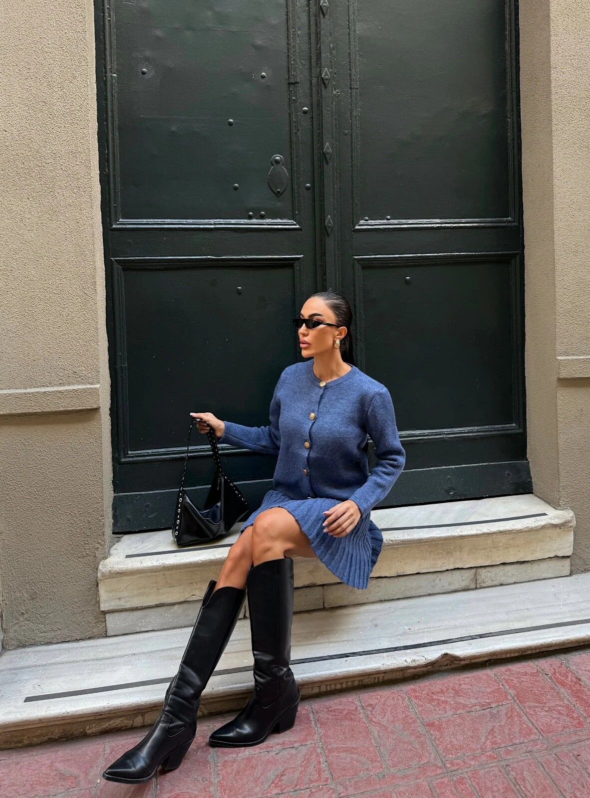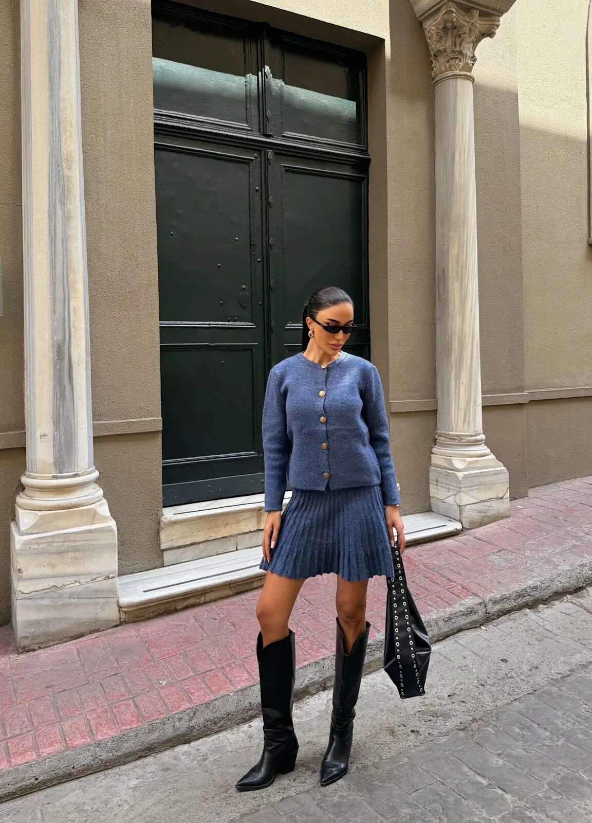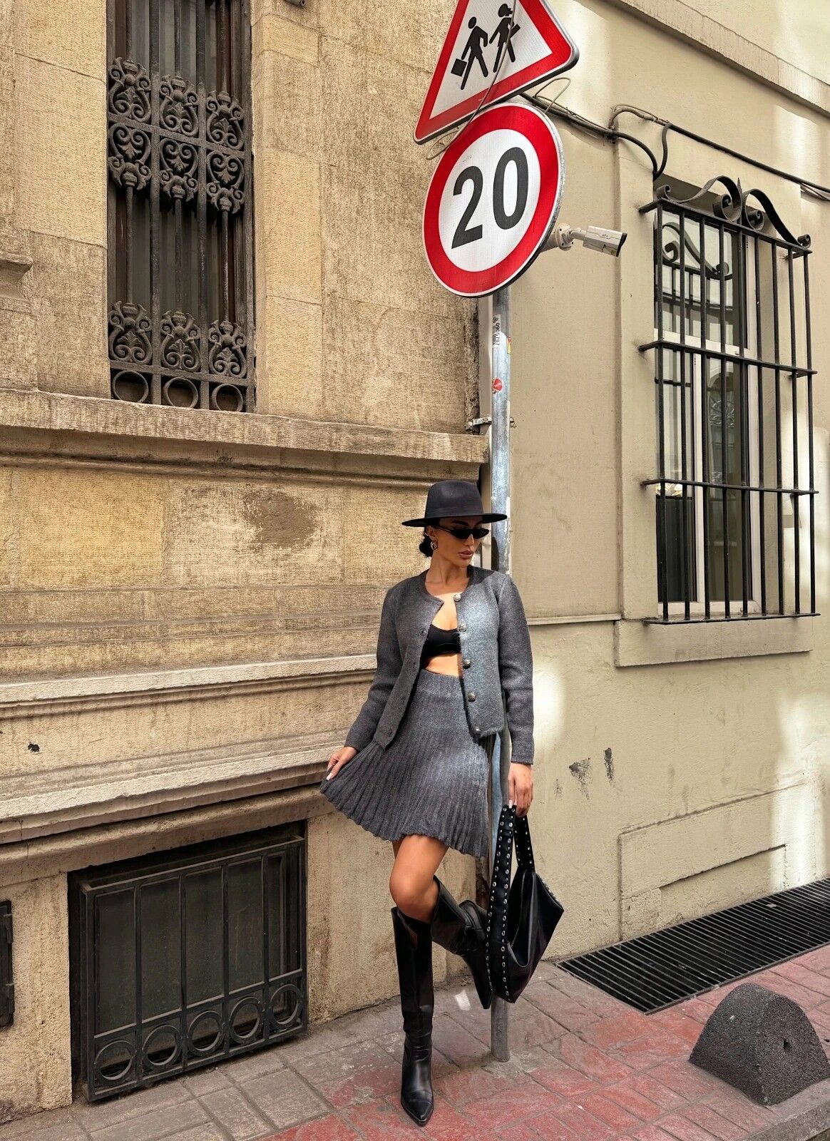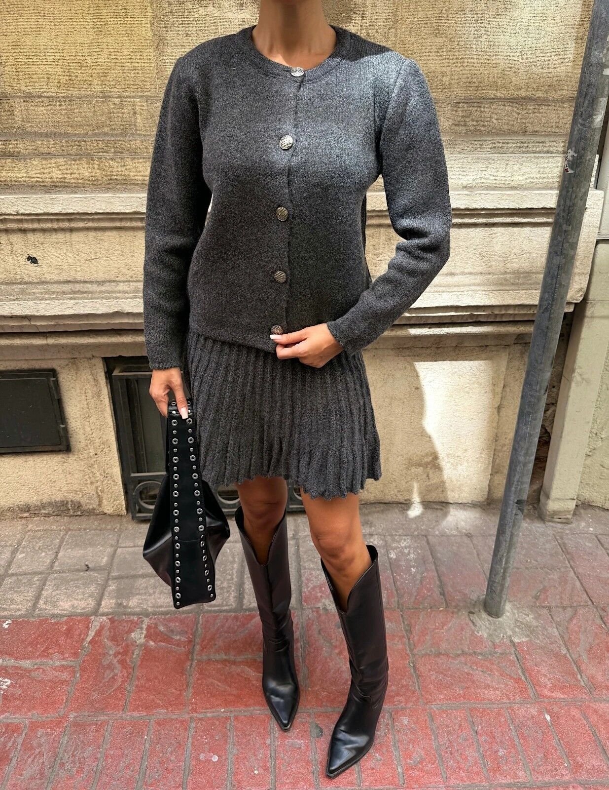 - Gri tonlarındaki zarif tasarımıyla her ortama uyum sağlayan triko takım, modaya uygun bir görünüm sunar.; - İki parçadan oluşan bu set, hem hırka hem de etek olarak kombinlenebilir ve şıklığı pratik bir şekilde tamamlar.; - Beli lastikli etek tasarımı, rahat bir kullanım sağlarken feminen bir siluet oluşturur.; - Örgü dokuma tipi ile kalın ve dayanıklı yapısı, soğuk havalarda sıcak tutarken stilinizden ödün vermez.; - Full düğme kapama özelliği sayesinde kolayca giyilip çıkartılabilir ve şık bir detay olarak öne çıkar.; - Regular kalıp, vücut hatlarınıza uyum sağlayarak rahat bir kullanım imkanı tanır.