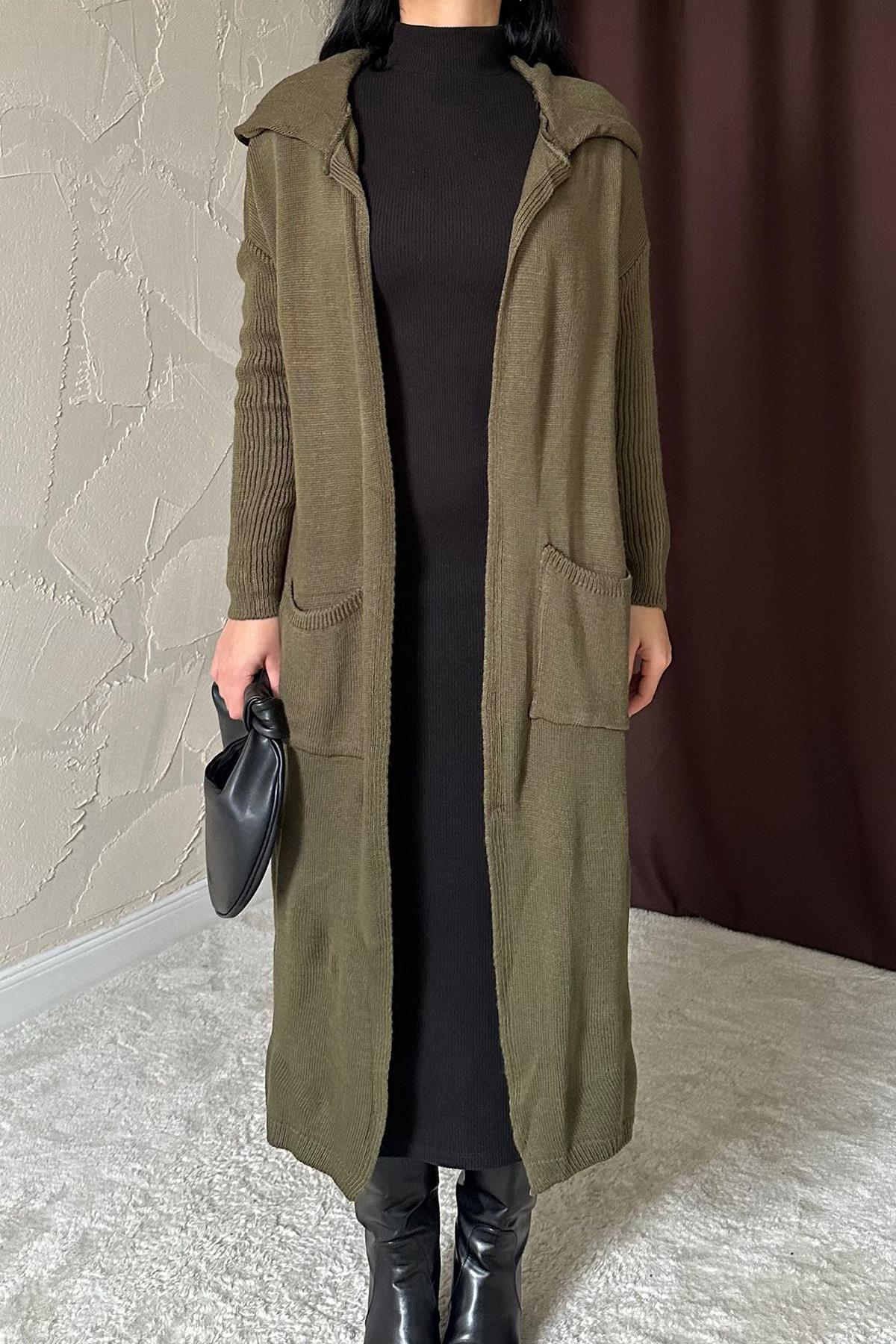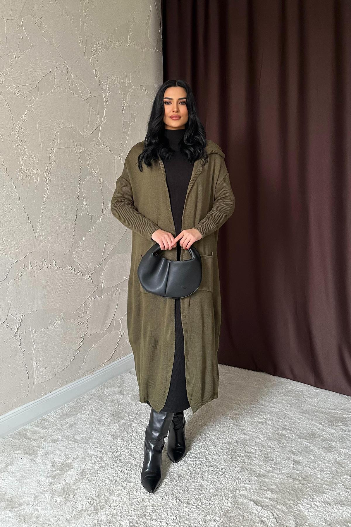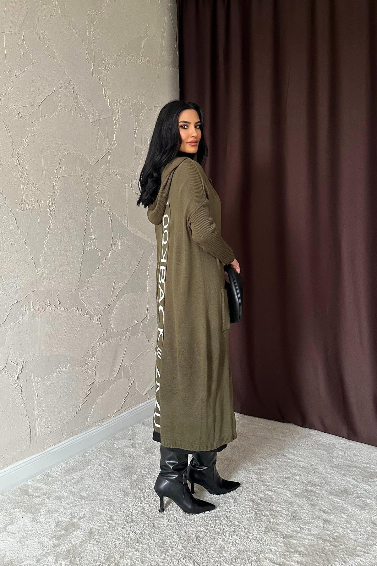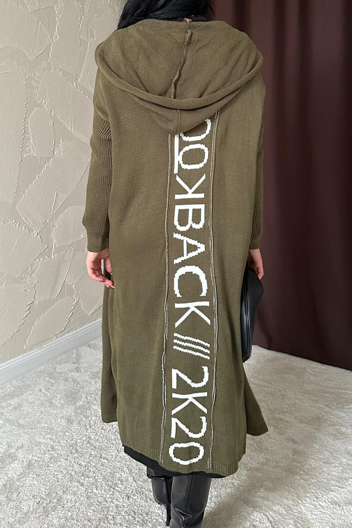 Kapüşonlu ; sırtı yazı baskılı ; uzun boy ; haki ; %100 akrilik yumuşacık giy,çık hırka
