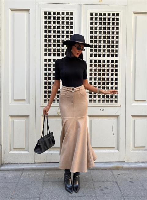 süet modasının trendi etek balık kesim olup şık ve feminen bir duruş şağlar.